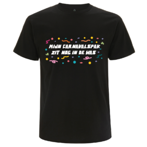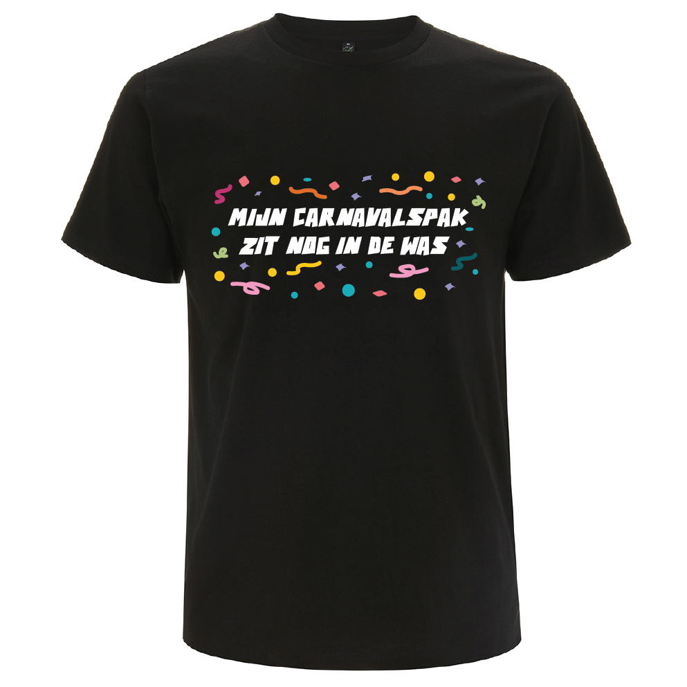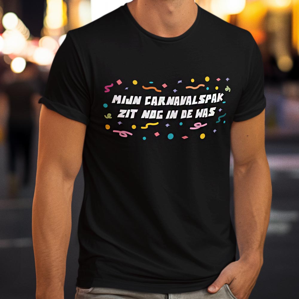 Geen pak, geen stress. Dit T-shirt met de tekst “mijn carnavalspak zit nog in de was” is dé oplossing voor een makkelijke carnavalsoutfit met humor.