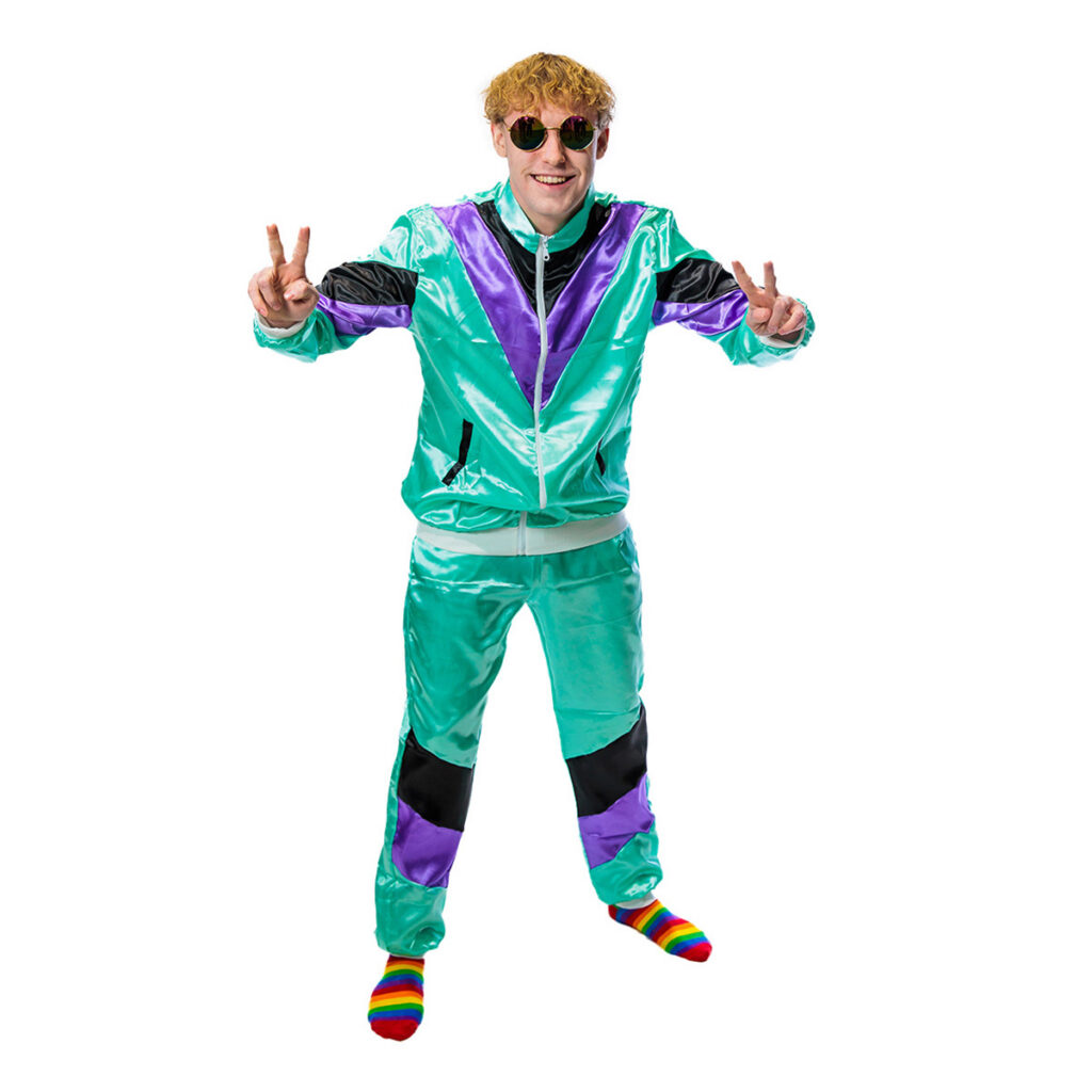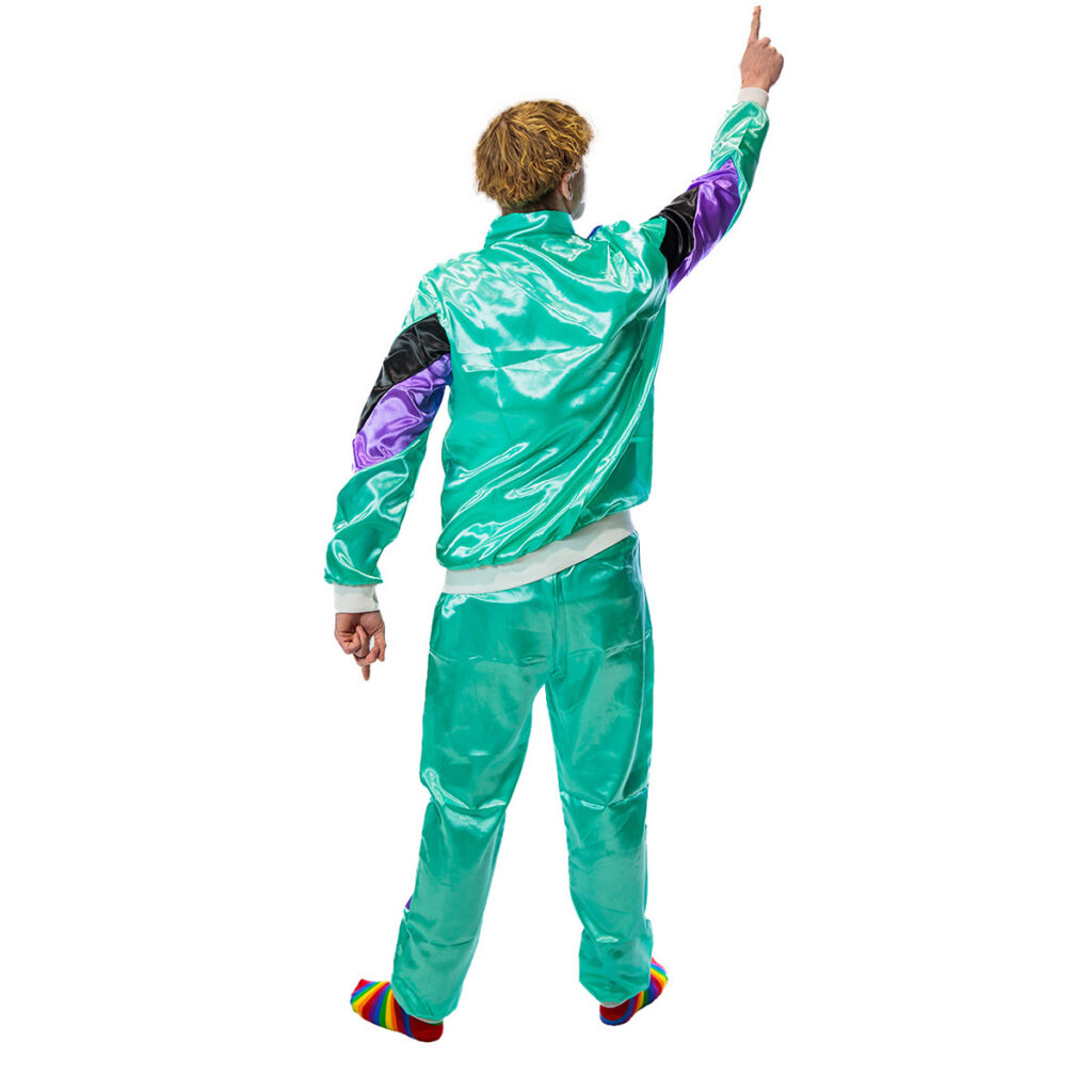 Laat je stijl knallen met dit turquoise foute trainingspak! Dit opvallende pak is een eerbetoon aan foute, maar fantastische mode met zijn turquoise basis, zwarte accenten en paarse strepen. Comfortabel en toch gedurfd, dit trainingspak is de perfecte keuze voor wie op zoek is naar een mix van retro charme en eigentijdse flair. Of je nu de straten verovert of gewoon lekker relaxt in stijl, dit pak laat je stralen als een ster op een retro podium. Trek het aan en laat die kleurrijke hippie vibes de wereld veroveren!