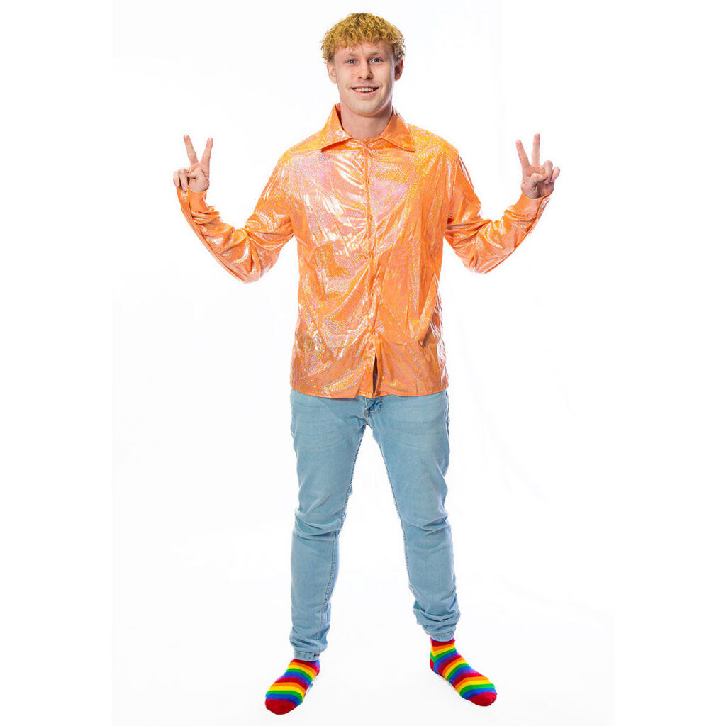 Deze kleurrijke regenboog disco glitter blouse is perfect voor een 70’s avond of feestje maar kan ook gebruikt worden met de Pride! De blouse is geschikt voor heren en is gemaakt van 100% polyester met een satijnen look. Extra leuk om te dragen met carnaval of een themafeestje. Met deze party blouse maak je jouw feestoutfit helemaal af!