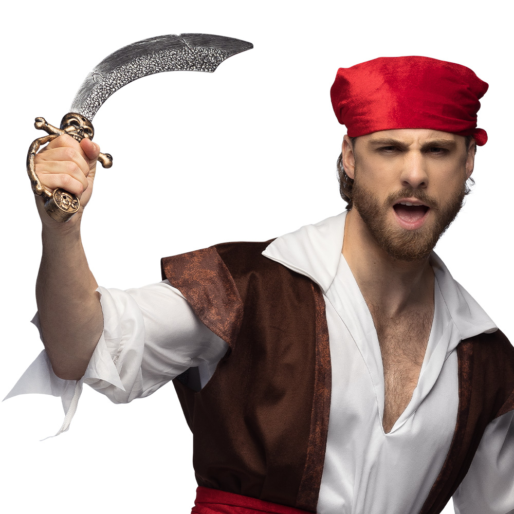 Maak je piratenoutfit af met dit stoere piratenzwaard! Met zijn gebogen zilveren lemmet en opvallende gouden handgreep met schedel-detail ben je helemaal klaar voor het volgende themafeest of carnaval. Een perfect accessoire om de piratenlook tot leven te brengen!